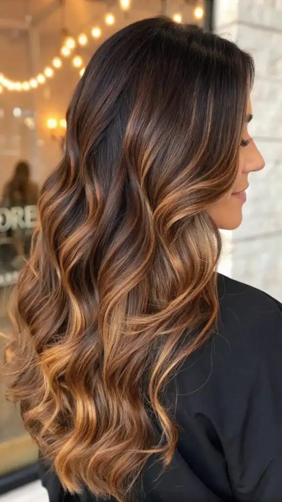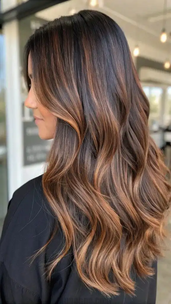 This versatile color works exceptionally well on layered cuts, where the shifting tones can emphasize the hair’s texture and movement. The smoky elements prevent the bronze from appearing too red or brassy, making this an excellent option for those who want warmth without orange undertones. The neutral nature of this balayage suits a wide range of skin tones.balayage long hair.