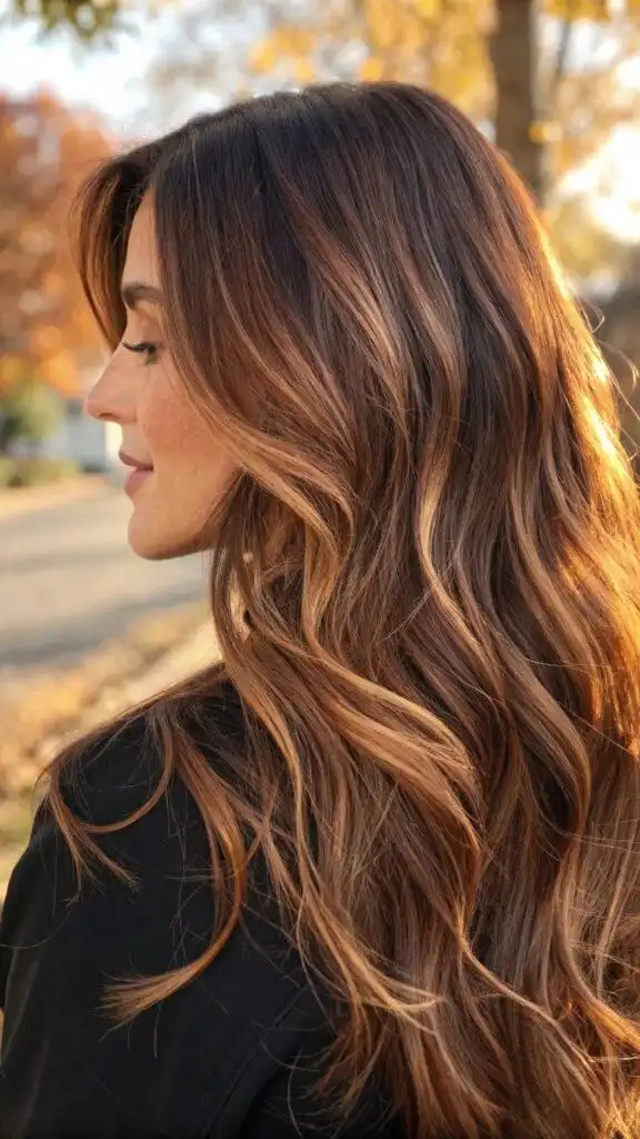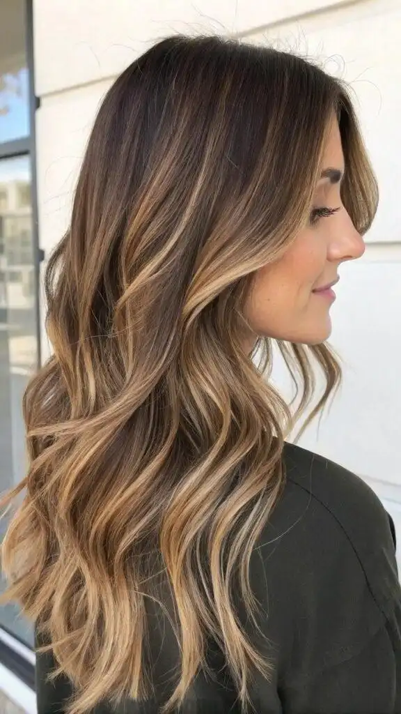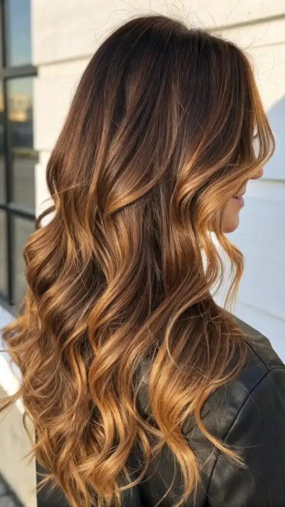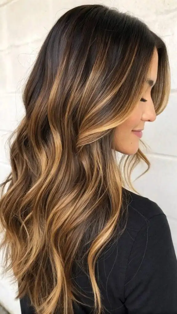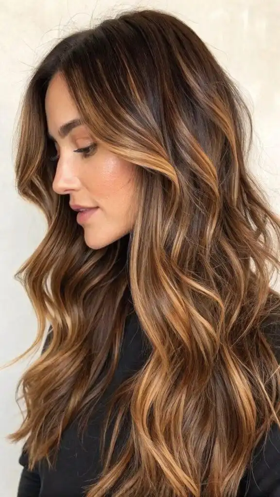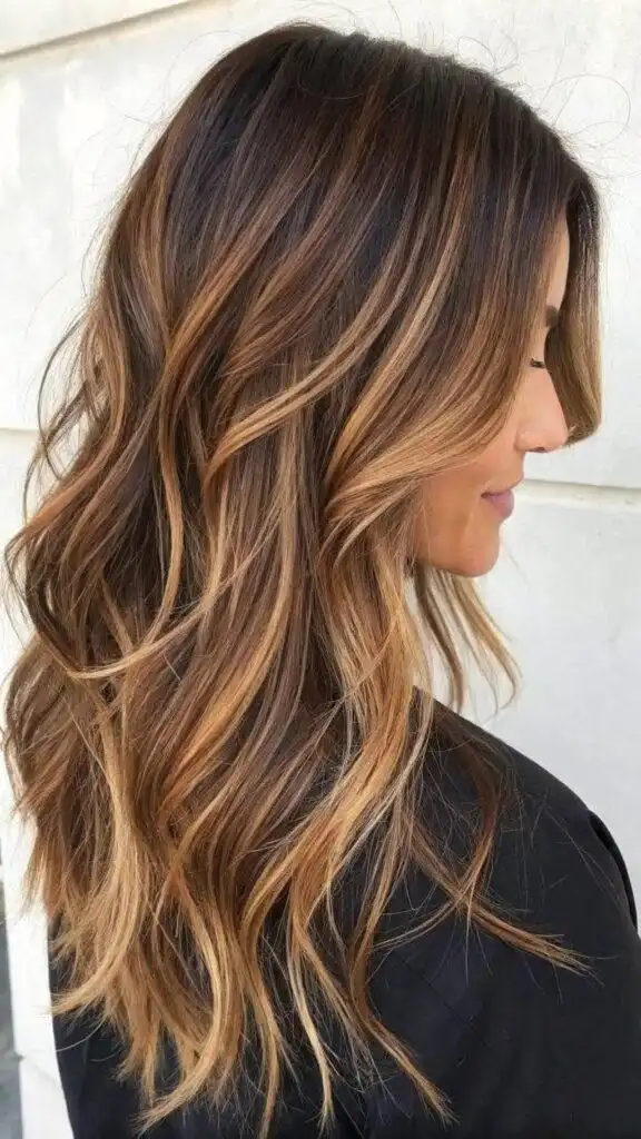 This technique particularly excels on long layered cuts, where the ribbons of color can emphasize the hair’s natural texture and movement. The strategic placement creates visual interest without obvious striping or chunky highlights. These warm caramel tones complement most skin types, adding a touch of warmth that enhances the complexion naturally.