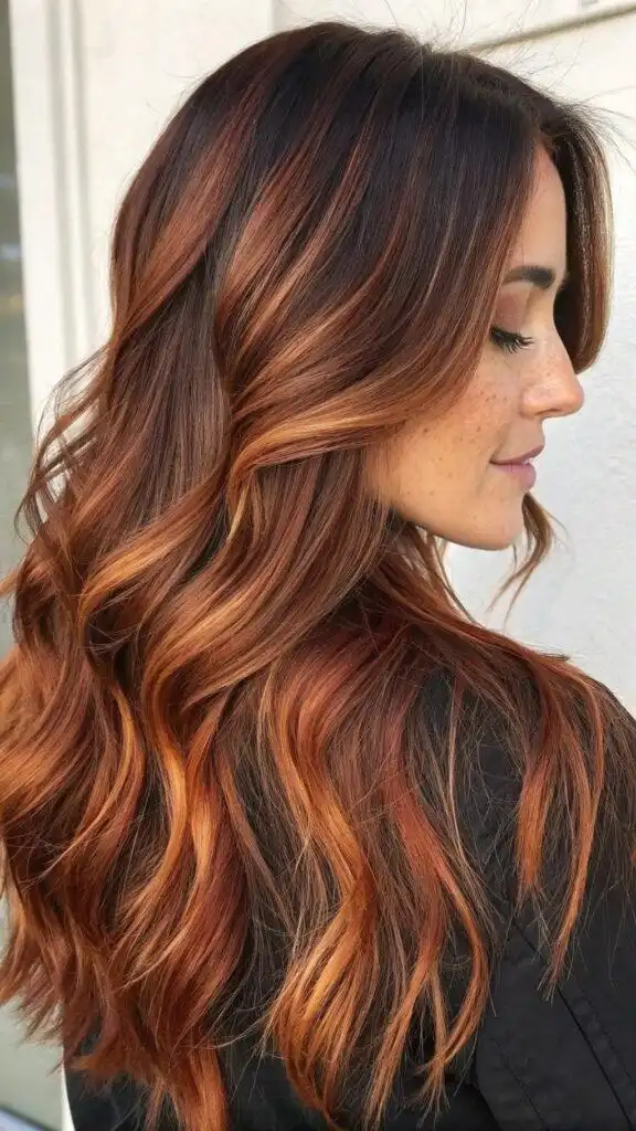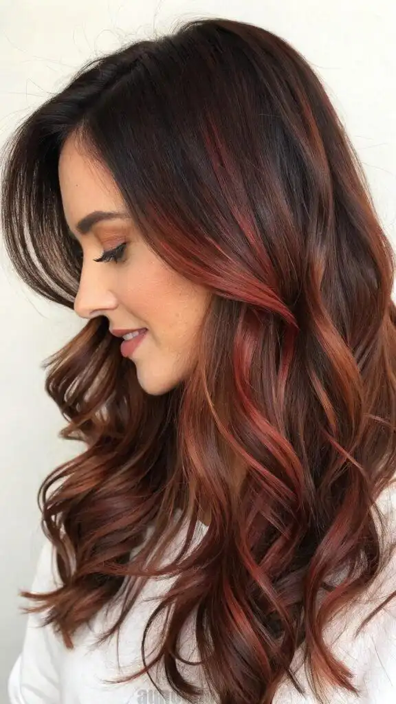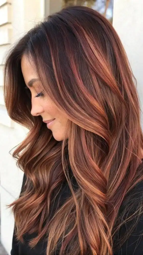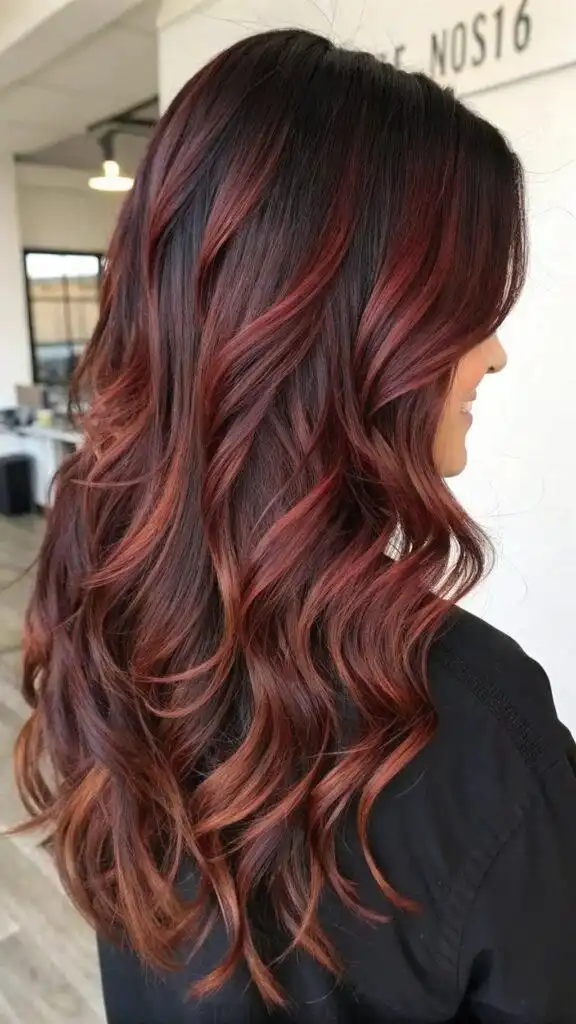 The depth of this style makes it particularly striking on thick, long hair where the multiple tones can truly showcase their dimension. The red undertones enhance your natural color rather than overpowering it, making this an excellent choice for brunettes wanting to experiment with red without dramatic change. This color combination flatters medium to deep skin tones exceptionally well.balayage long hair.