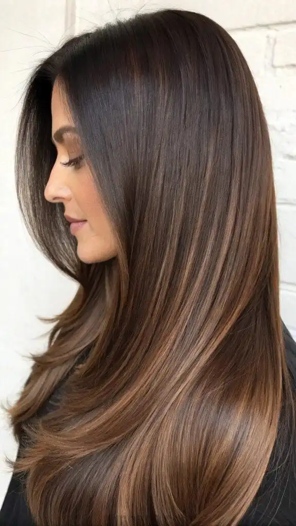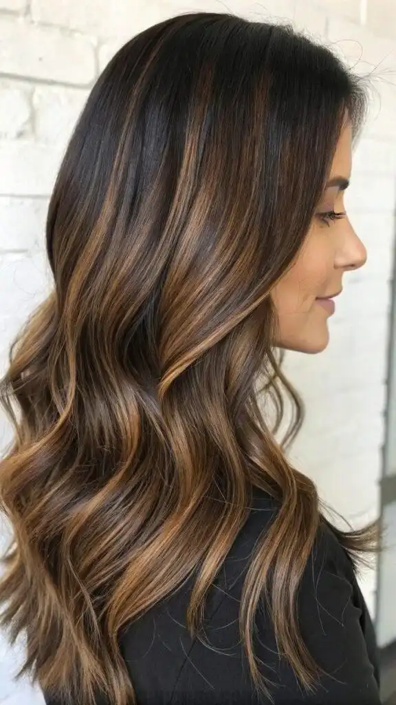 The soft transition from dark to light creates an elegant, timeless look that’s simultaneously modern and classic. The dimensional color catches light beautifully, preventing dark hair from appearing flat or one-dimensional. This style particularly suits those with warm skin tones, as the mocha highlights add a complementary warmth to the complexion.