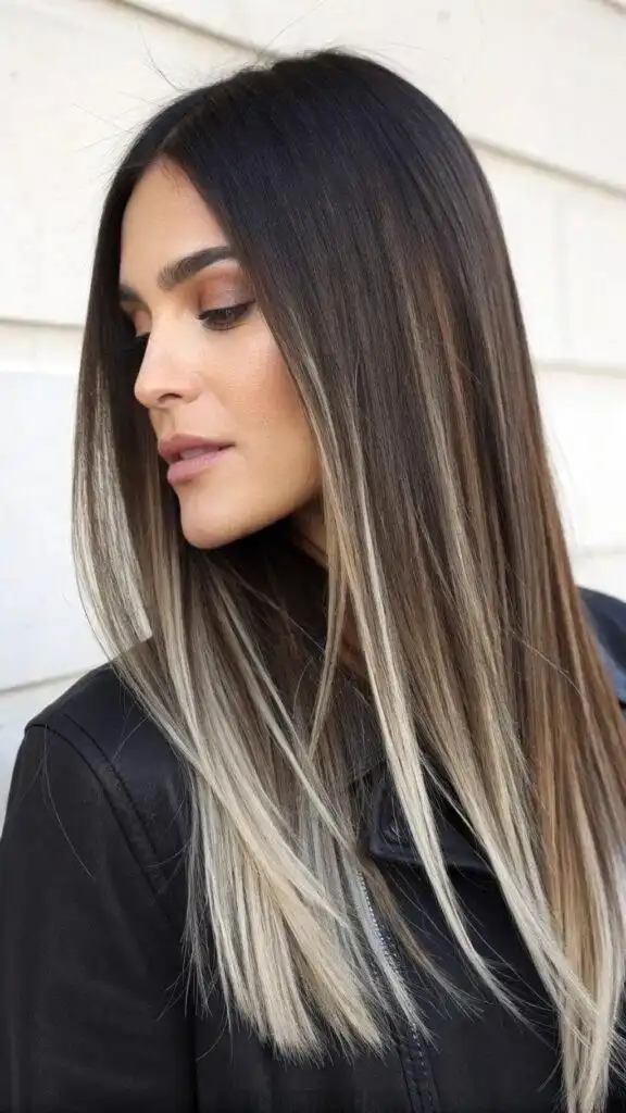 Icy blonde balayage creates dramatic contrast against darker bases, introducing striking platinum highlights that command attention. This bold technique places cool, almost-white blonde pieces strategically throughout long hair, focusing on face-framing sections and ends to create a high-impact look. The dramatic light-to-dark transition offers incredible dimension rarely achieved through other coloring methods.