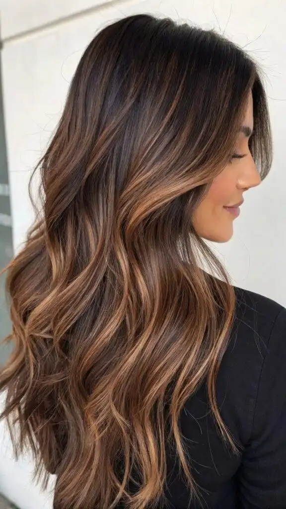 This sophisticated color strategy adds depth and movement to long hair, preventing dark colors from appearing flat or heavy. The strategic placement of lighter tones creates the illusion of thickness and volume, particularly beneficial for fine hair. The rich chocolate tones complement warm and neutral skin tones, adding a subtle warmth to the complexion.