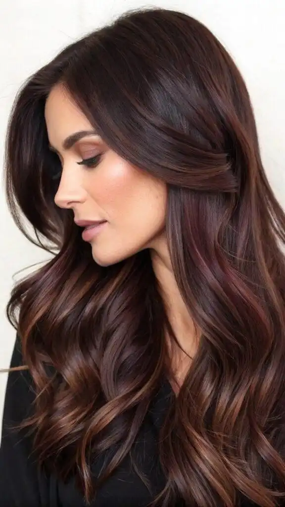 Mahogany balayage incorporates deep wine-red tones into long hair, creating a sophisticated, multidimensional color profile with incredible depth. This technique introduces varying intensities of mahogany, creating a luxurious effect that shifts from subtle to striking depending on the light. The red undertones add richness without the commitment or maintenance of all-over red color.