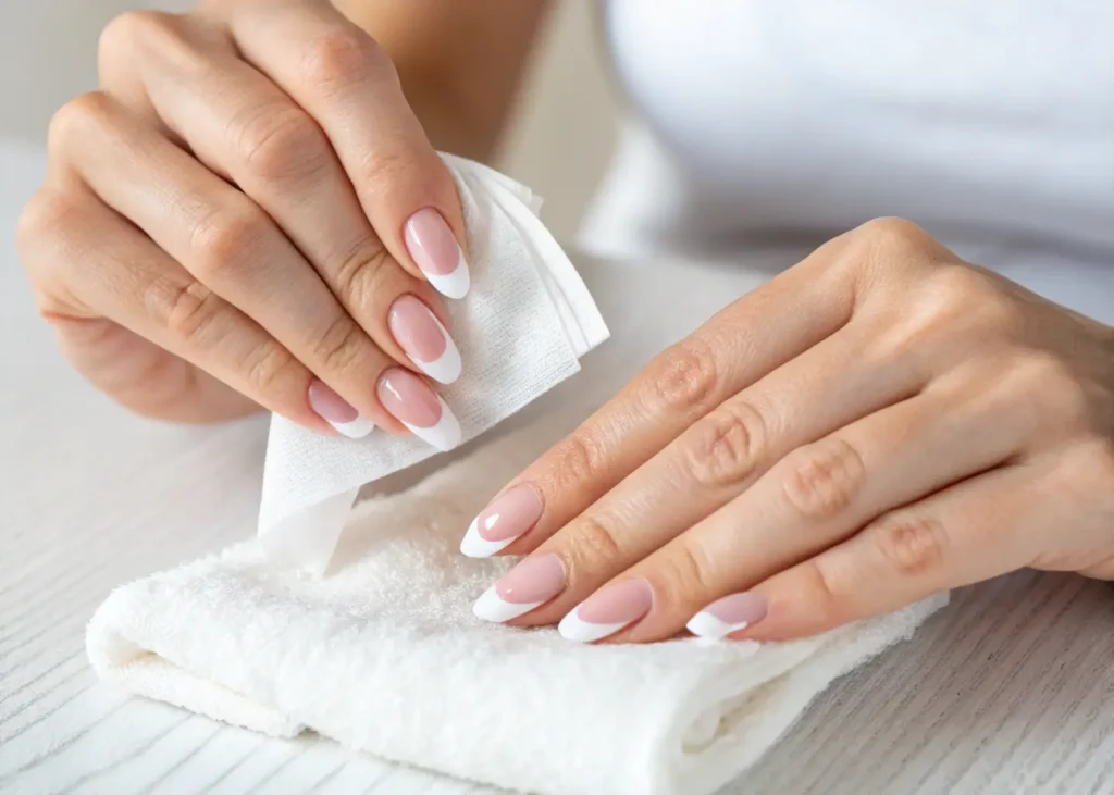Clean your hands carefully with wipes until all traces of the previous nail polish have been totally removed. You can use baby wipes. Avoid using any harsh chemicals or nail care products with chemicals in them as this may increase the likelihood that the acrylic foundation may dissolve.