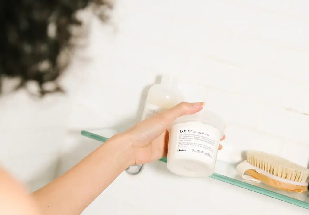 - Position yourself correctly: Tilt your head forward or to the side, depending on your comfort and hair length. This positioning helps water and conditioner distribute through your curls more effectively.