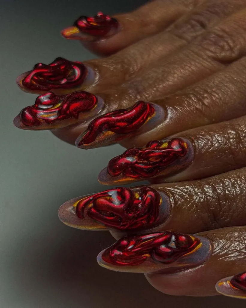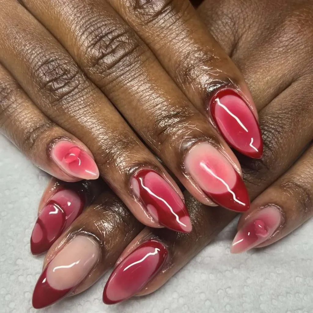 The trending “aura” effect meets dark cherry in this ethereal design, where the deep shade appears to radiate light from within, creating a mystical, multidimensional finish that elevates traditional dark cherry nails.