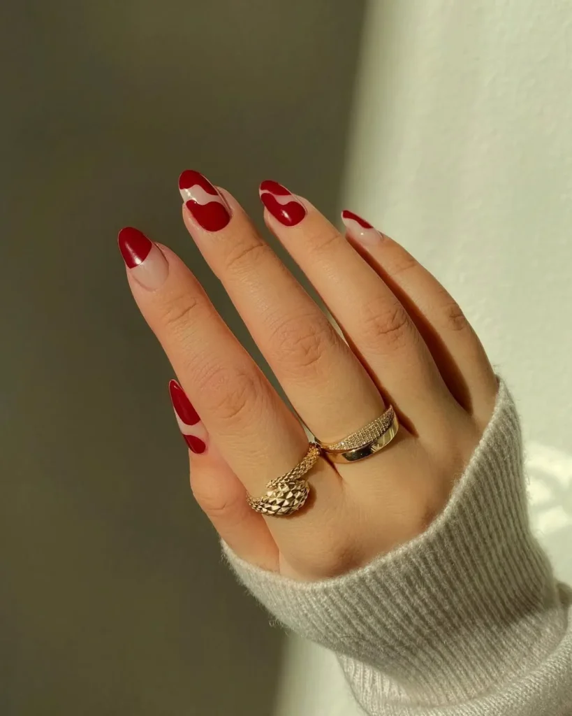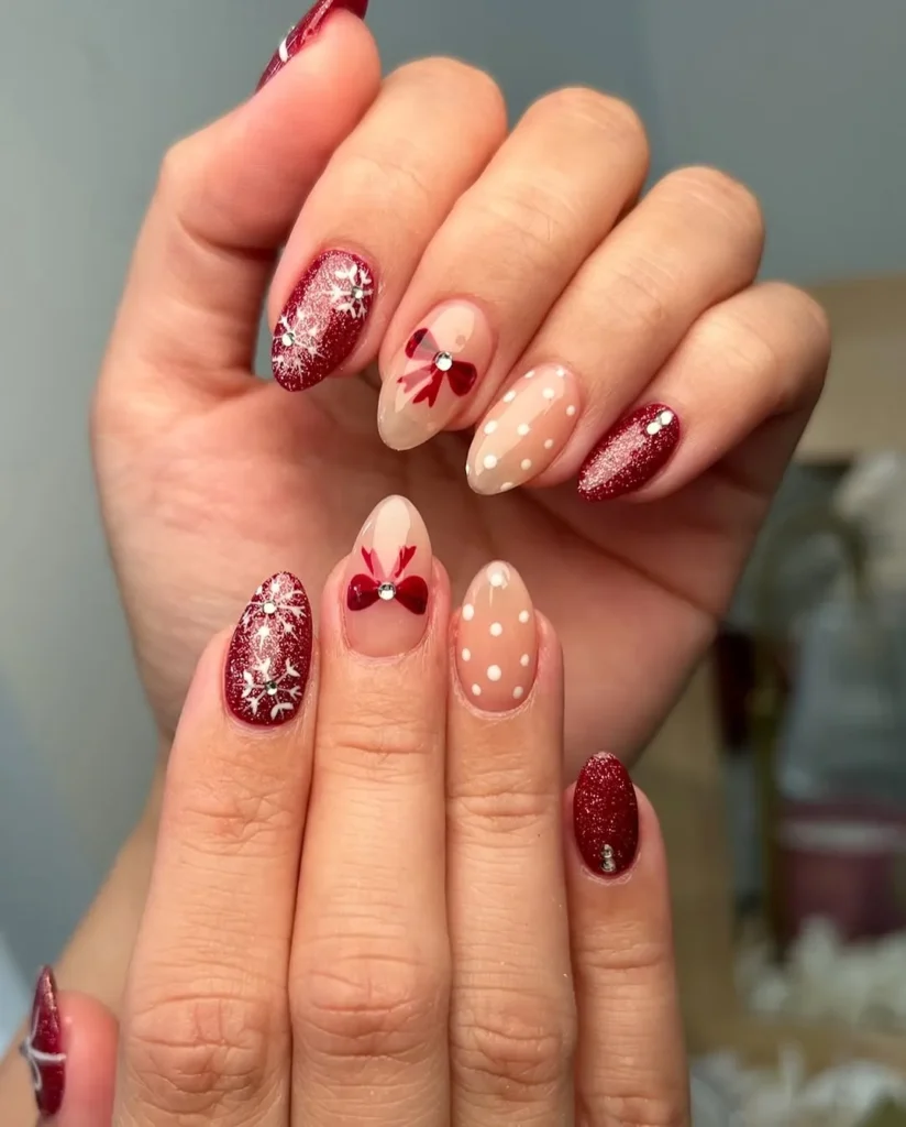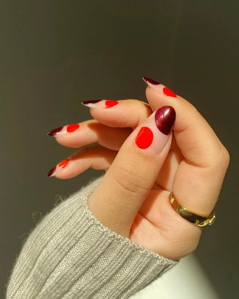 Playful yet refined, this design pairs dark cherry nail polish with brighter red dots for a whimsical contrast that maintains its sophistication through careful color coordination.