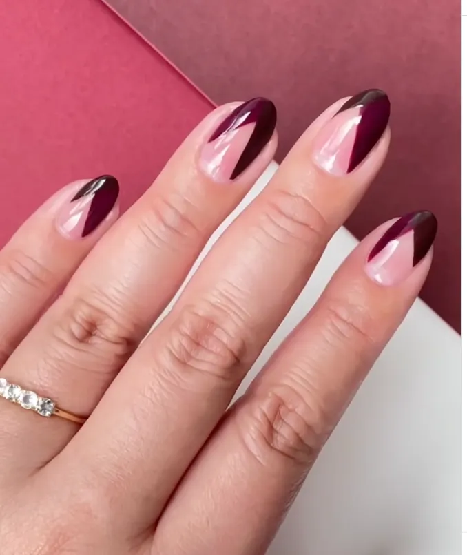 This modern interpretation of the vintage half-moon manicure uses negative space to striking effect, with the dark cherry nail polish framing the natural nail bed in an unexpected way.