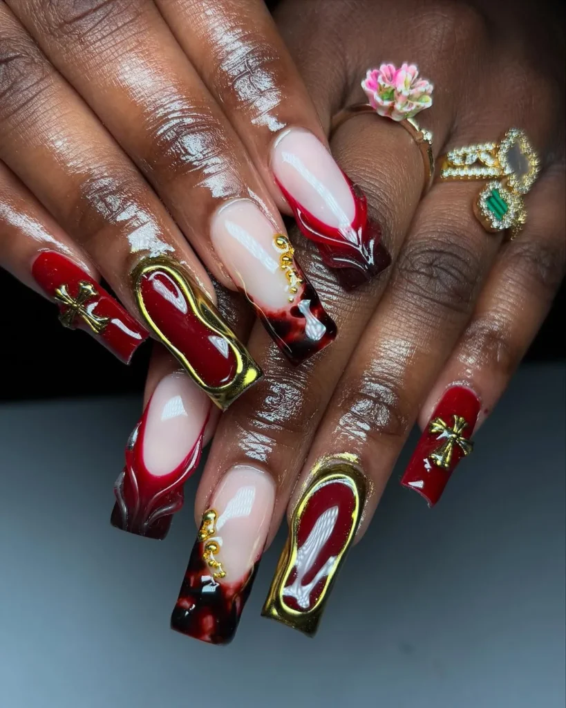 The classic tortoiseshell pattern gets reimagined through a cherry-tinted lens, creating an unexpected twist on a familiar favorite that works year-round for dark cherry nail enthusiasts.