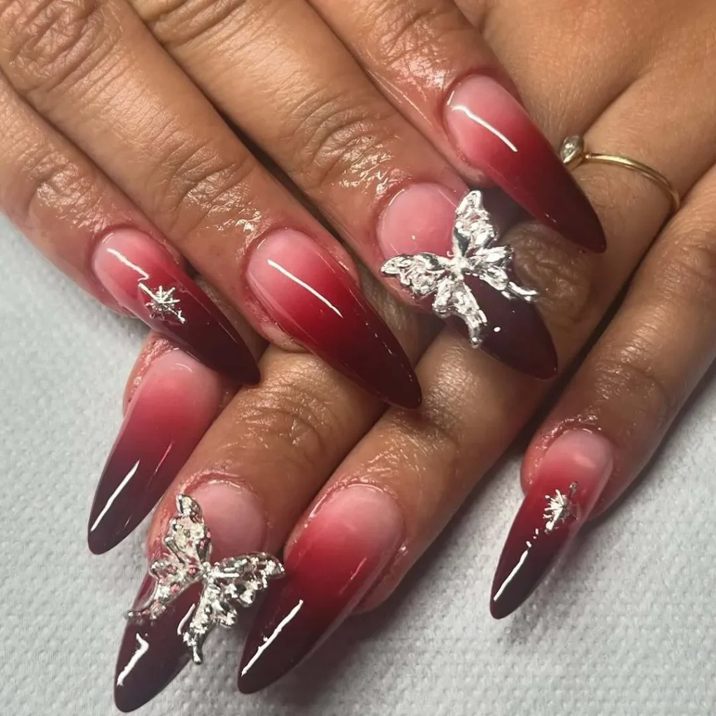 Delicate pink transitions to bold cherry in this romantic gradient, softened further with delicate silver butterfly accents—ideal for bridging the gap between sweet and statement-making dark cherry nail art.