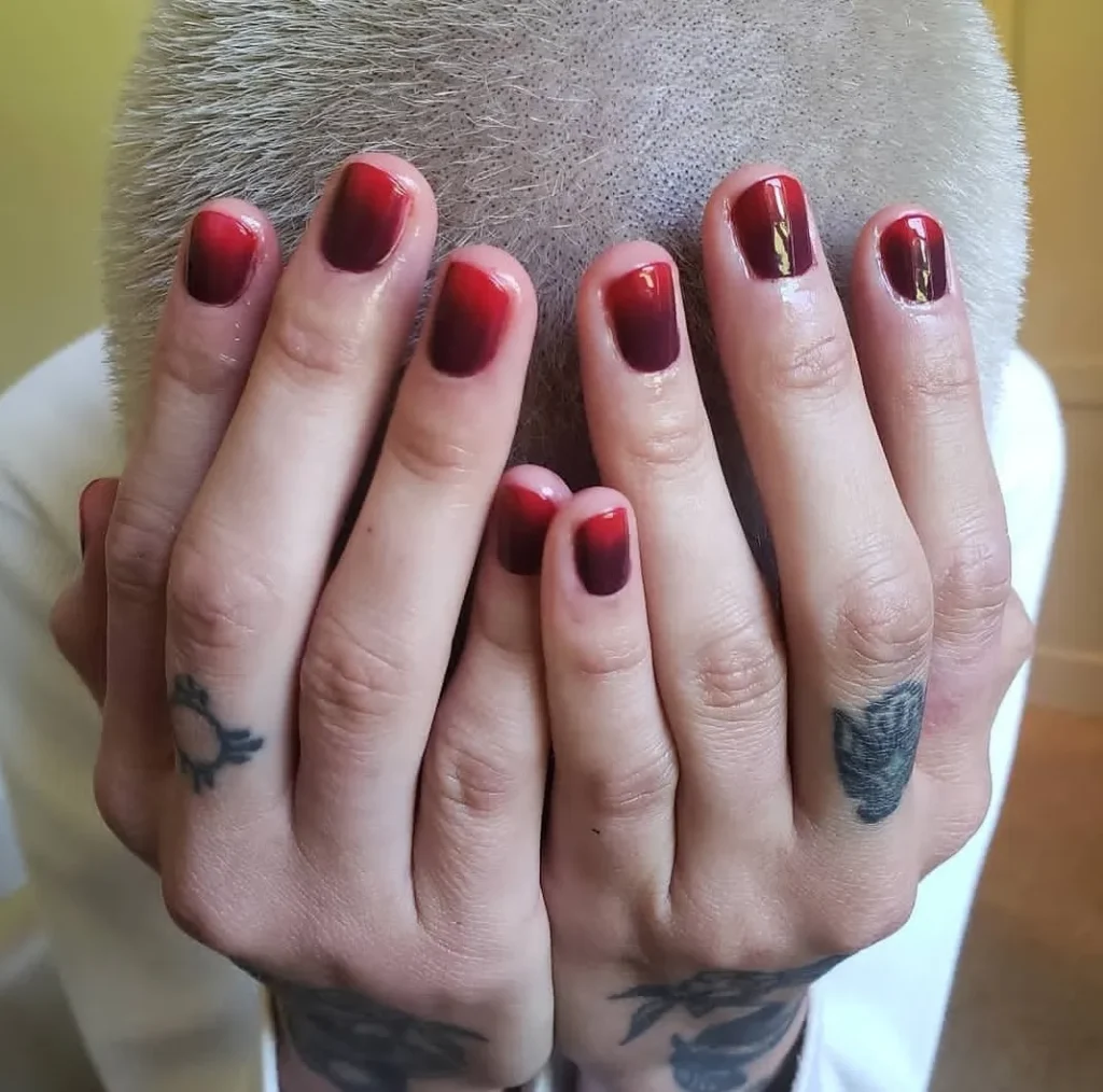 For the ultimate dramatic effect, this gradient moves from deepest black to rich cherry, creating a smoldering look that captures light differently across the nail’s surface.