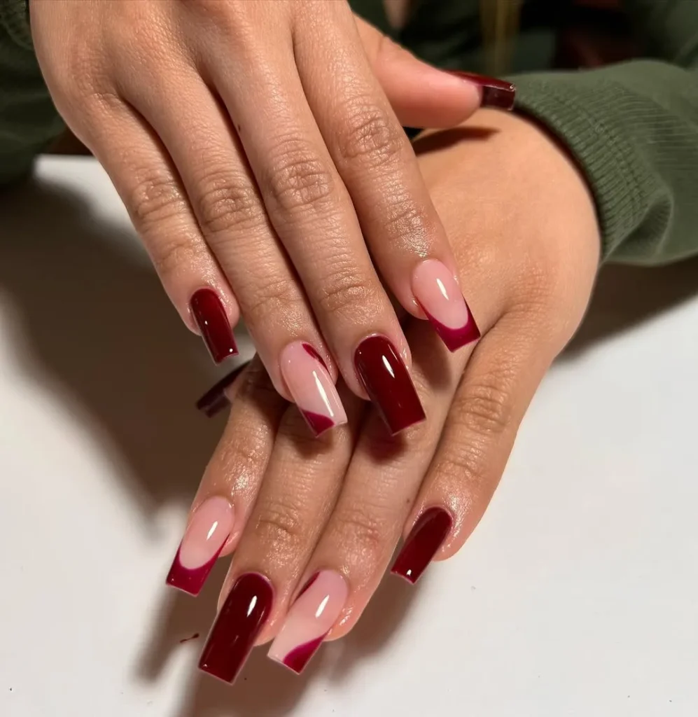 The modern square nail shape provides the perfect canvas for a reinvented French tip in dark cherry, offering clean lines and geometric precision for those who love dark cherry nails with structure.