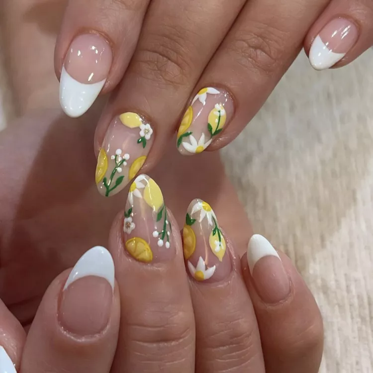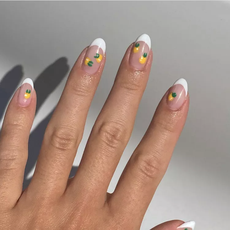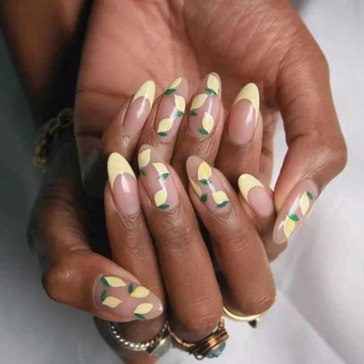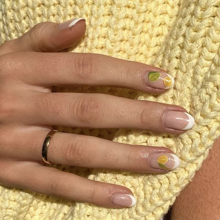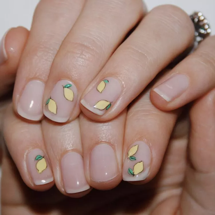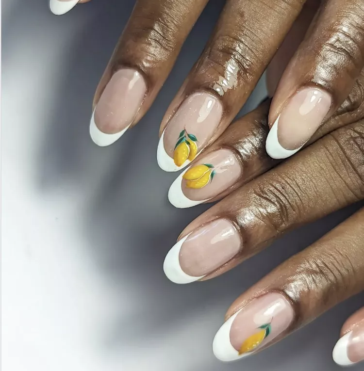 Combine two popular trends with this lemon French manicure that perfectly balances sophistication and playfulness. The crisp white tips provide the classic element, while the tiny hand-painted lemons add unexpectedly charming details. These lemon nails demonstrate how a traditional style can be transformed with just a touch of citrusy creativity.