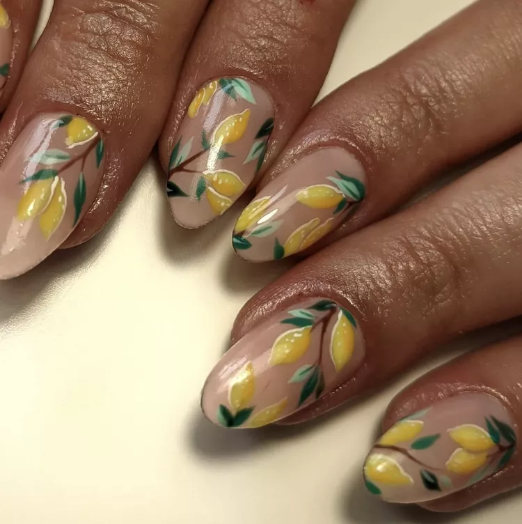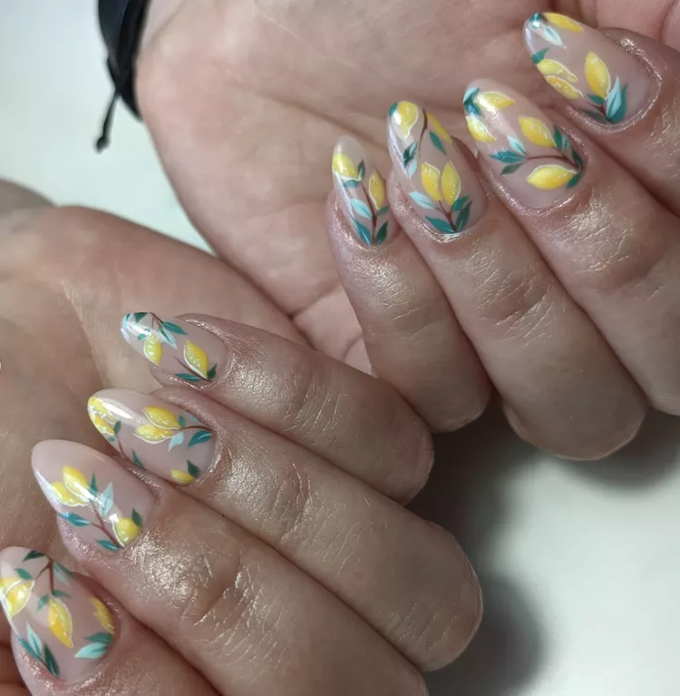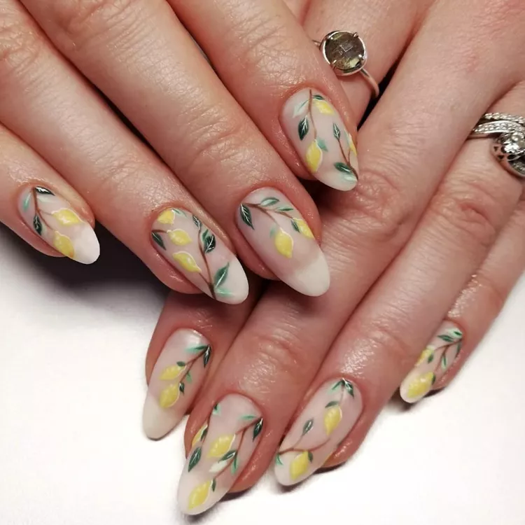 Add sophisticated texture to your lemon nails with a luxurious matte finish. The velvety surface creates an interesting contrast with the naturally glossy appearance we associate with citrus fruits. The lemon tree motif, complete with branches and leaves, adds a narrative element to these stylish lemon nails.