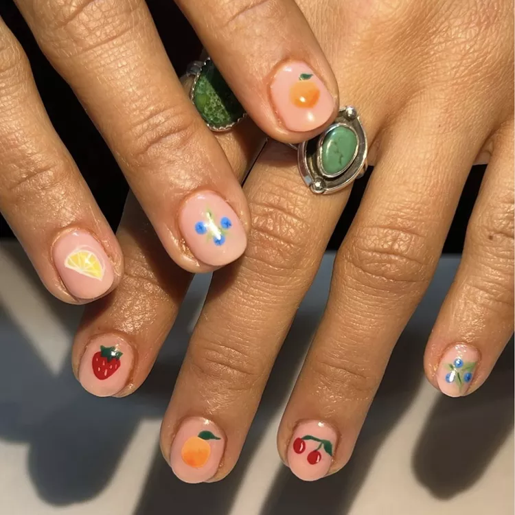 For the fruit enthusiast who appreciates restraint, this design features a single perfectly detailed fruit on each nail. The nude base creates a cohesive canvas that allows each miniature masterpiece—including the stunning lemon nails—to shine independently while still contributing to a harmonious overall look.