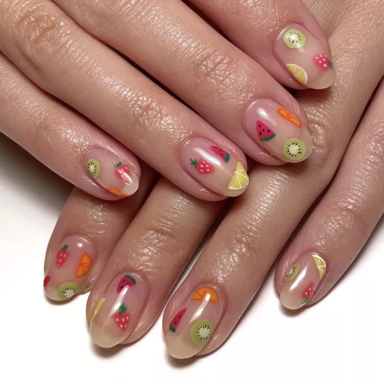 Turn your nails into a miniature fruit basket with this cheerful design. Alongside vibrant lemon slices, you’ll find watermelon, strawberries, kiwi, and oranges—each meticulously detailed to create a summer cornucopia. These lemon nails celebrate the season’s bounty and add a playful punch of color to your fingertips.