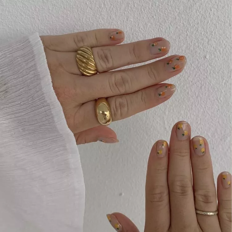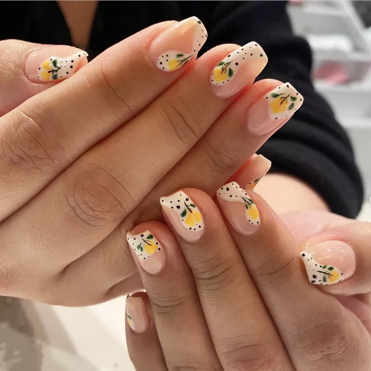 Embrace minimalism with these elegantly restrained lemon nails. Small drops of citrus are strategically placed on a crystal-clear base, creating a modern, airy aesthetic. This approach to lemon nail works beautifully for those who appreciate subtle design elements and clean, contemporary style.