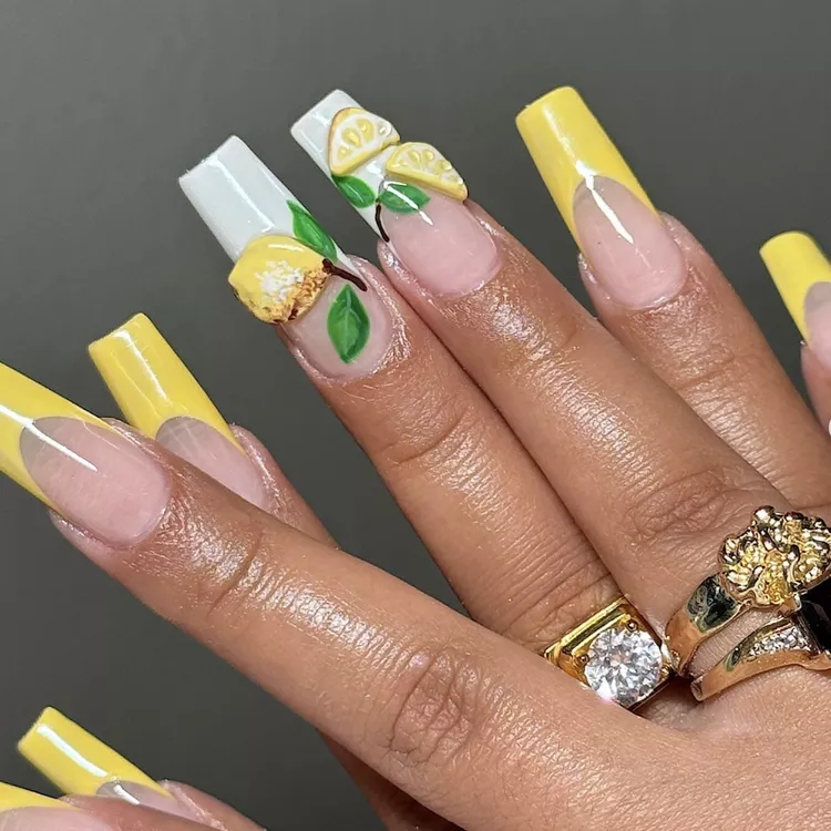 Take your lemon nails to extraordinary heights with these show-stopping 3D designs. The raised lemon embellishments create texture and dimension that catch the light from every angle. Alternating between classic white and sunny yellow French tips provides the perfect foundation for these statement-making lemon nails.