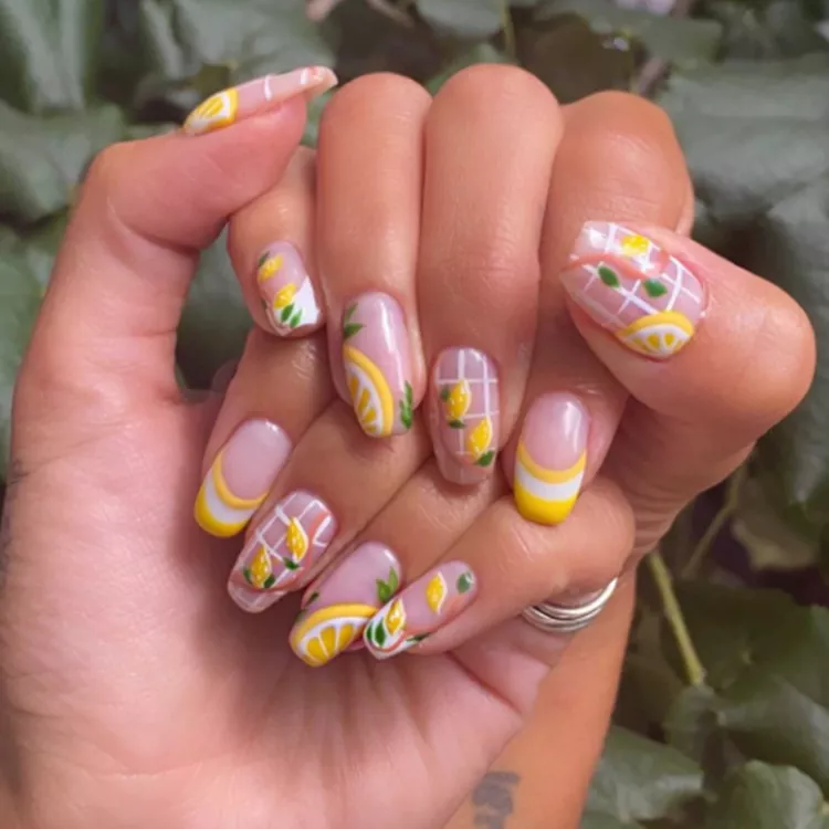 Why stop at just lemons? This refreshing citrus medley incorporates both lemon and lime slices for a vibrant flavor explosion on your fingertips. The complementary yellow and green color palette creates a cohesive look while offering twice the citrus inspiration. These lemon nails are perfect for summer adventures and tropical getaways.