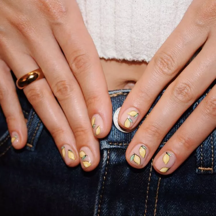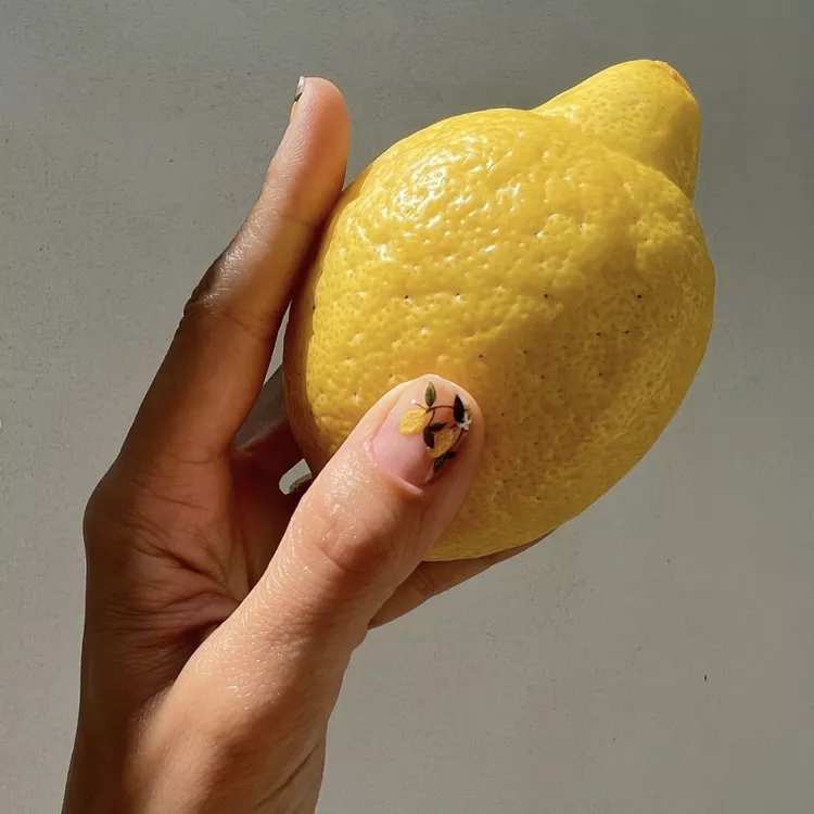 Short nails deserve stunning lemon nail art too! This design proves that nail length is no obstacle to creating beautiful lemon nails. The transparent base creates a modern, glass-like effect that makes the meticulously detailed lemons appear to float on your fingertips. This minimalist approach to lemon nail works beautifully for those who prefer subtle yet striking manicures.