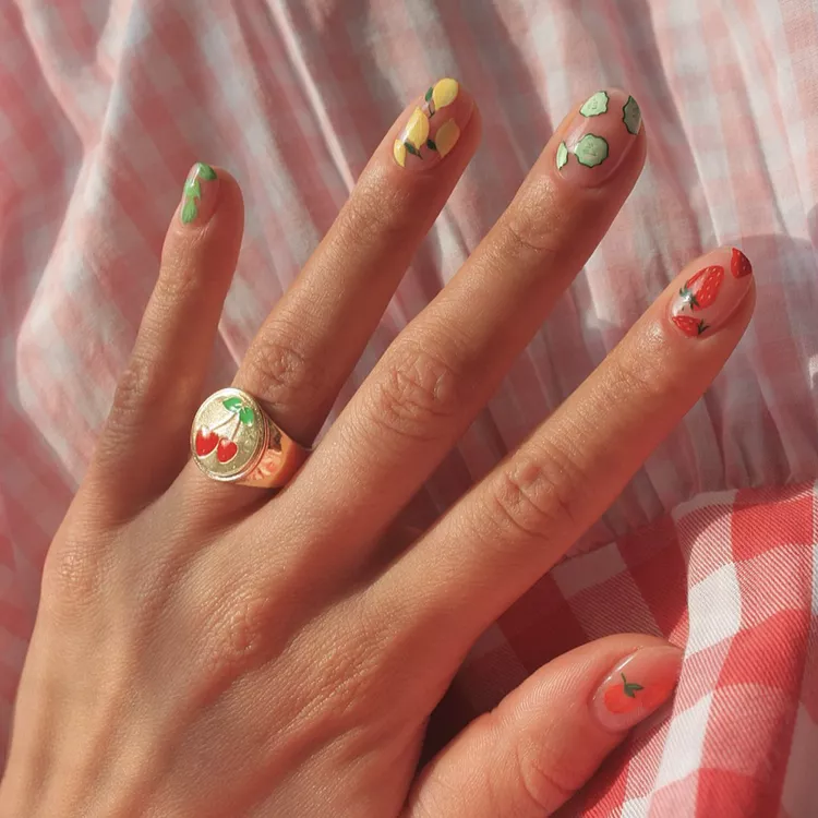 These lemon nails capture the essence of summer dining with a picnic-inspired design. Beyond lemons, you’ll find garden-fresh elements like strawberries, cucumbers, tomatoes, and herbs—creating a farm-to-fingertip aesthetic. The cheerful selection of fresh ingredients makes these lemon nail perfect for food enthusiasts and outdoor entertainers.