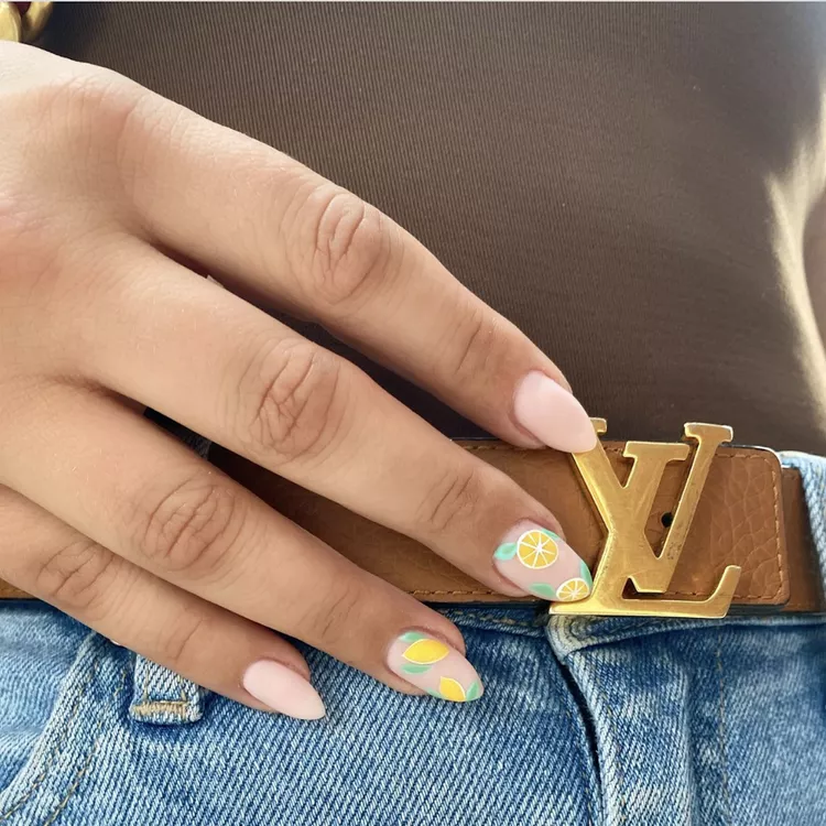 Double the lemons, double the style! This clever design features pairs of lemons strategically positioned at different angles on each nail. The transparent base creates the illusion of lemons floating in sparkling water, while their varied placement ensures a visually interesting pattern. These lemon nails strike the perfect balance between cohesion and creativity.
