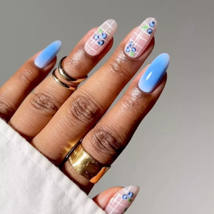 This May nail idea takes inspiration from the popular “milk” nail trend but gives it a seasonal twist with a blueberry hue. The base features a translucent milky blue that’s reminiscent of spring skies, while accent nails incorporate actual blueberry designs for a playful touch. The combination creates a cohesive theme without being overly literal. What makes this one of the most appealing May nail ideas is its balance between trendy and timeless elements—the milk nail technique feels current, while the soft blue palette remains classically spring-appropriate. The effect is both soothing and seasonally relevant.