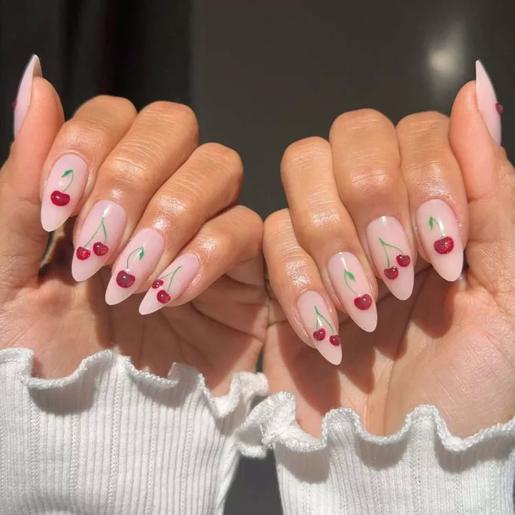 Early May marks the beginning of cherry season, making this fruity design particularly timely. Unlike conventional flat cherry nail art, this May nail idea elevates the concept with dimensional elements. Three-dimensional cherry sculptures crafted from builder gel create a playful, tactile effect that catches both light and attention. Set against a soft pink background, the vibrant red cherries with delicate green stems offer a perfect balance of whimsy and sophistication. This May nail idea works especially well on longer nail beds, where the 3D elements have room to shine without overwhelming the hand.