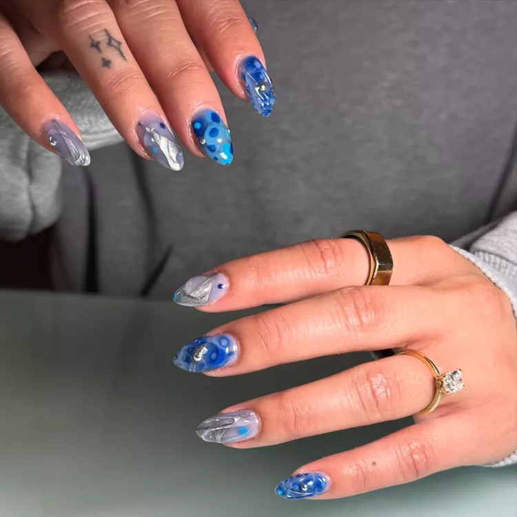 While spring typically calls for warm hues, this unexpected May nail idea proves that cool tones can feel equally seasonal. The design features multiple shades of blue—from pale sky to deep cobalt—arranged in geometric patterns with raised textural elements. Silver accents add dimension and reflect light beautifully, creating movement as your hands change position. This refreshing take on May nail ideas offers a sophisticated alternative to traditional spring colors while still feeling completely appropriate for the season. The blues evoke May’s rain showers that bring blooming flowers, making this a thoughtfully seasonal choice.