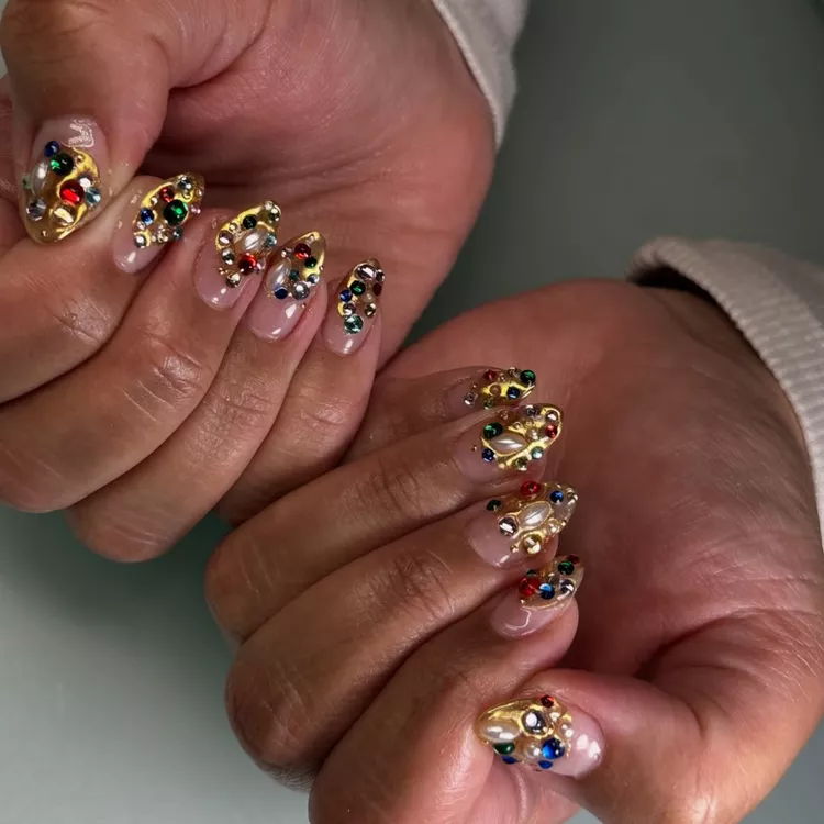 This opulent May nail idea caters to those who appreciate luxury and dimension in their manicures. The design features carefully placed gemstones and metallic embellishments against a neutral base, creating a jewelry-like effect on the nails. Gold raised elements provide structure, while multi-colored crystals catch and reflect light with every movement. Though bold, this design remains tasteful through strategic placement of embellishments, with some nails featuring more elaborate decoration than others for balance. Among May nail ideas, this option speaks to those celebrating special occasions or simply those who embrace Taurus season’s appreciation for life’s finer things.