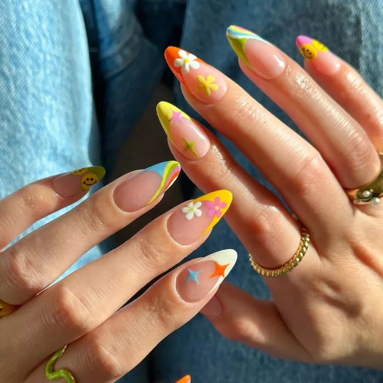 This retro-inspired May nail idea brings 1970s flower power into the modern era. Cheerful daisies in classic white and yellow are complemented by rainbows and smiley faces for a vintage-inspired design that feels nostalgically optimistic. The technique involves hand-painting each element against a neutral background, creating a deliberate handcrafted quality. Among May nail ideas, this design captures the carefree spirit of the season while incorporating multiple trending elements. The combination of icons creates a storytelling quality that makes these nails conversation starters at any spring gathering.