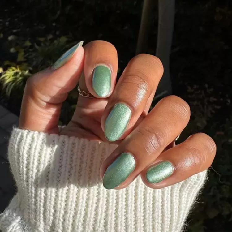 This ethereal May nail idea transforms a simple sage green base into something magical through the addition of ultra-fine shimmer particles that create a glass-like effect. As light hits the nails, they appear almost translucent while maintaining that beautiful soft green hue that captures May’s natural palette. The shortened nail length enhances the wearability for everyday, while the high-gloss finish amplifies the glass-like quality. Among May nail ideas, this option offers a perfect balance between subtle and special—understated enough for professional settings but with enough visual interest to feel intentionally styled.