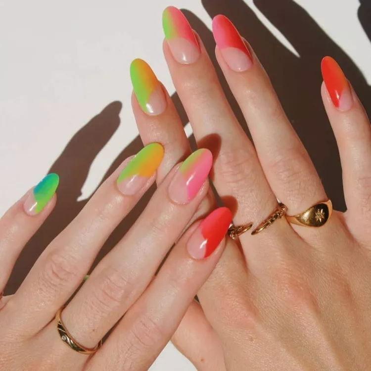 As May progresses and summer approaches, this bold May nail idea embraces the energy of the coming season. Rather than flat neon colors, this design features a gradient of bright hues that blend into one another, creating a diffused effect that softens the intensity of the neons. The technique involves layering colors while they’re still wet, allowing them to merge organically at the boundaries. Among May nail ideas, this option appeals to those ready to make a statement and embrace the increasing vibrancy that late spring brings. The longer nail shape provides additional canvas space, enhancing the impact of this colorful design.