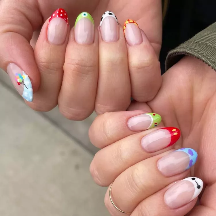 This contemporary twist on the classic French manicure exemplifies how May nail ideas can blend timeless elegance with playful innovation. Instead of the traditional solid white tips, each nail features a different patterned design—polka dots, stripes, tiny florals, and abstract shapes—all aligned along the tip to create a cohesive French line. The remainder of the nail stays neutral with a sheer pink or clear base, allowing the patterns to take center stage. This May nail idea offers incredible versatility, as you can customize the patterns and colors to match specific outfits or occasions while maintaining the recognizable French silhouette.