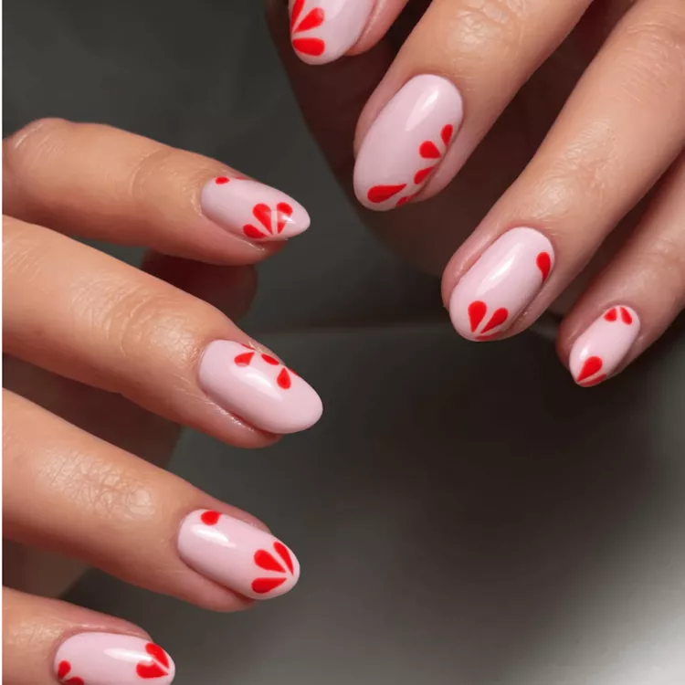 Pink never goes out of style, but this May nail idea refreshes the classic color with thoughtful application and design. A ballet pink base serves as the perfect backdrop for delicate crimson stencil work that creates intricate patterns resembling vintage lace or botanical illustrations. The contrast between the soft background and more vibrant detail work creates visual interest without overwhelming the eye. While traditionally Valentine’s-inspired colors, this combination feels thoroughly springlike when incorporated into May nail ideas through these botanical patterns, proving that color palettes can transcend their typical seasonal associations.