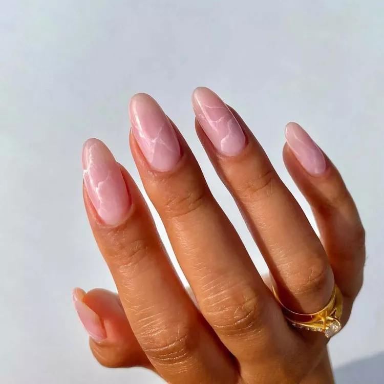 This elegant May nail idea draws inspiration from the gentle pink semi-precious stone. The technique creates a marbled effect in various shades of rose and blush, mimicking the natural variations found in actual rose quartz. What makes this one of the most sophisticated May nail ideas is its subtlety—the pattern appears almost incidental rather than deliberately created, enhancing its natural stone-like quality. The almond shape provides an elongating effect, while the high-gloss finish mimics the polished surface of actual gemstones. It’s a perfect choice for those who prefer their May nail ideas to whisper rather than shout.