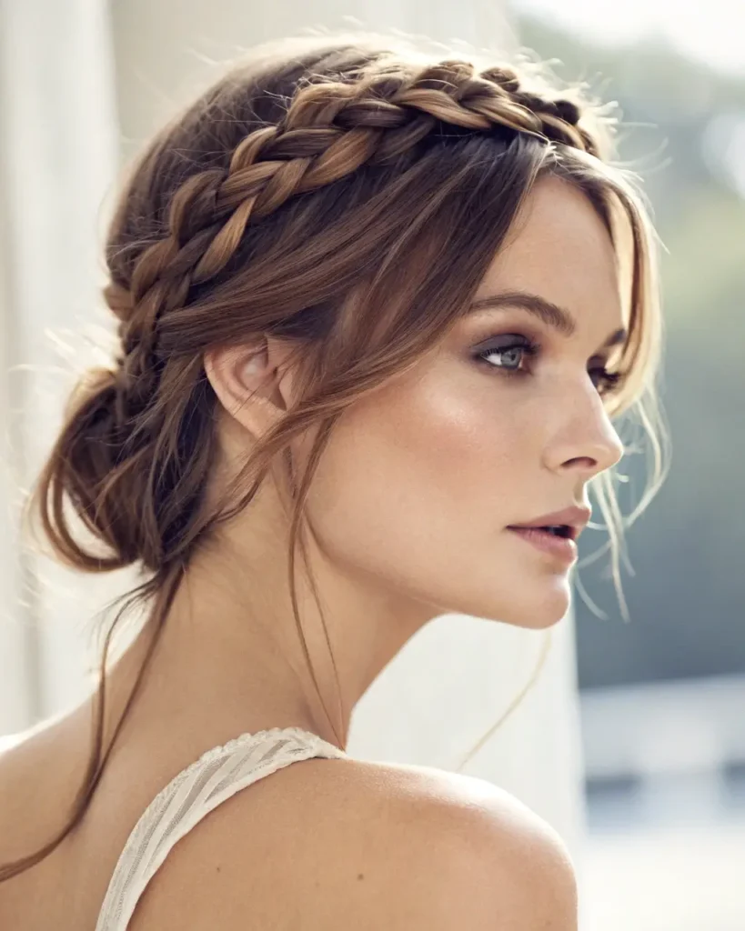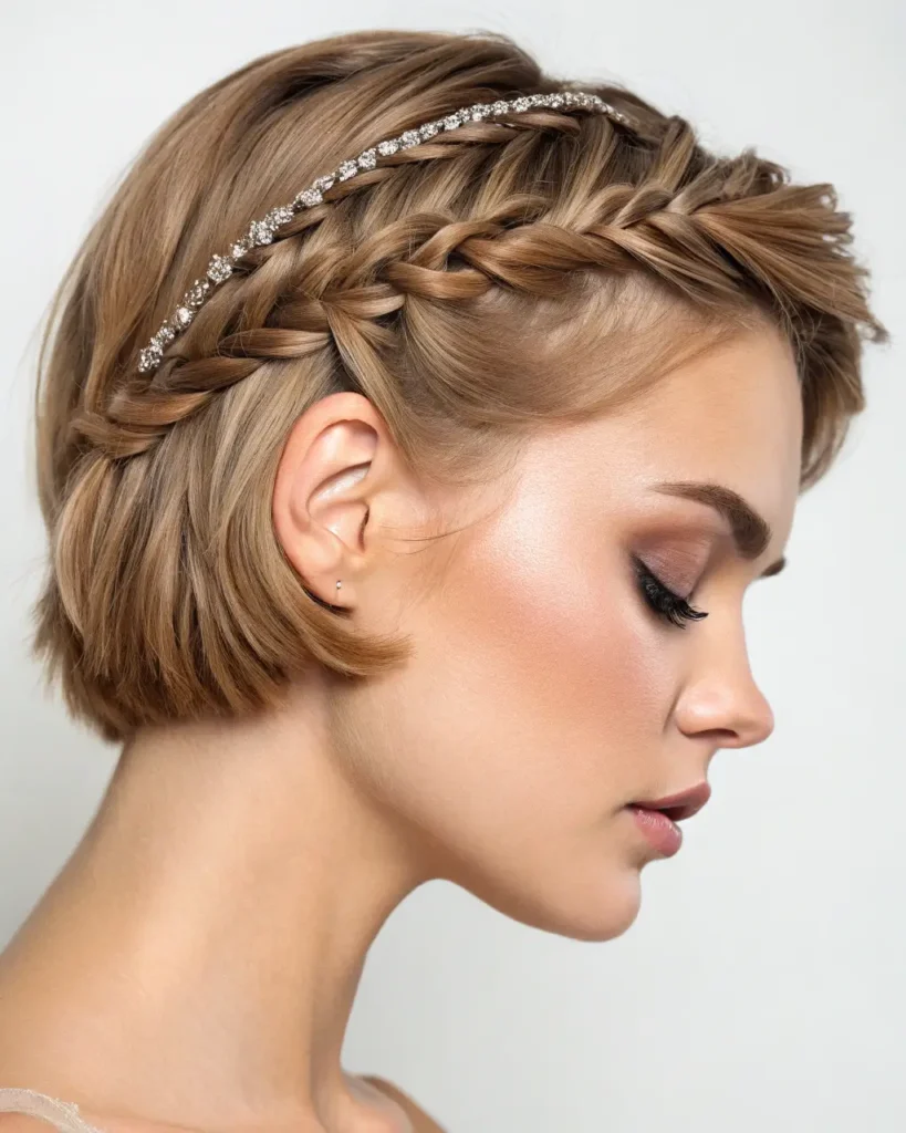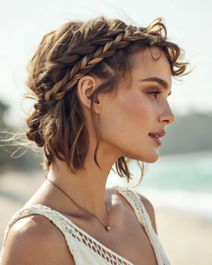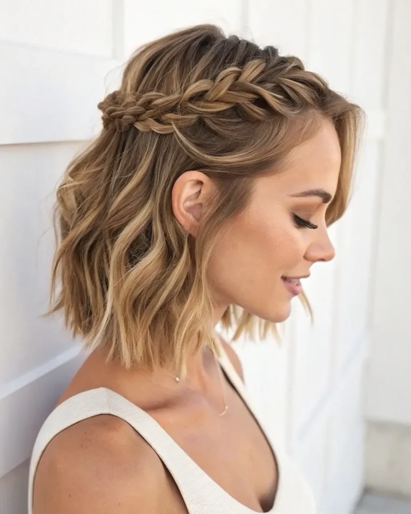 Create a royal look with a crown braid that wraps around your head. This short braid style is perfect for special occasions and works beautifully on shoulder-length hair.