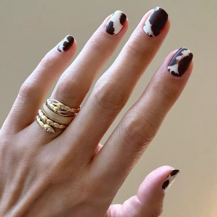 When exploring western nail ideas, few patterns capture authentic frontier style like cowhide print. This western nail idea features a contemporary blurred interpretation that softens the traditional black-and-white contrast for a more wearable everyday look. The slightly diffused edges create an artistic quality that elevates this classic western nail design beyond simple novelty. For best results, ask your nail artist to use a dry brush technique with negative space, allowing your natural nail to peek through as part of the design. Among popular western nail ideas, this approach works beautifully on both short practical nails and longer statement shapes.