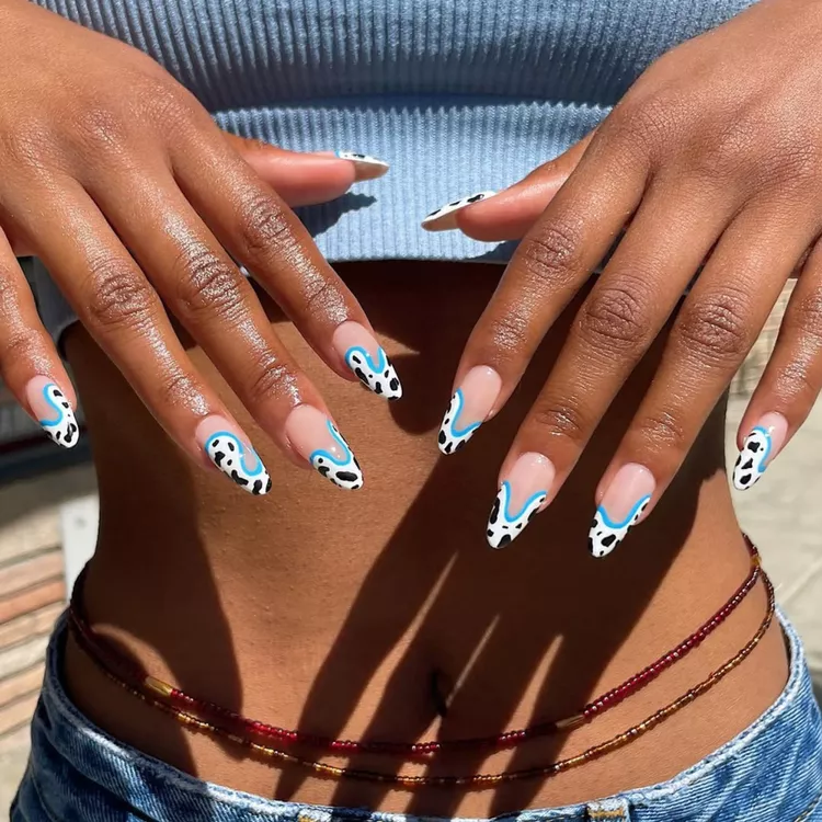 Traditional cow print receives a contemporary update in this undulating design that feels both playful and sophisticated. Rather than covering the entire nail, the distinctive black-and-white pattern creates a wave effect along each tip, outlined with a striking aqua blue border that adds unexpected dimension. This fresh interpretation demonstrates how classic Western elements can be reimagined through modern design techniques. The negative space between the pattern and cuticle creates a lengthening effect that flatters all nail shapes and sizes.