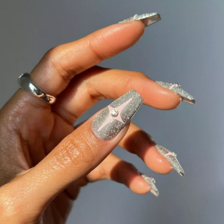 Western style often incorporates unexpected elements of glamour and shine—think rhinestone-studded performance wear and elaborately decorated rodeo queens. This playful nail design channels that tradition with a silver velvet base adorned with pastel pink starbursts and carefully placed rhinestones. The resulting look balances country inspiration with disco energy for a combination that feels simultaneously nostalgic and fresh. This design particularly shines for special occasions or whenever your outfit needs an extra touch of sparkle.