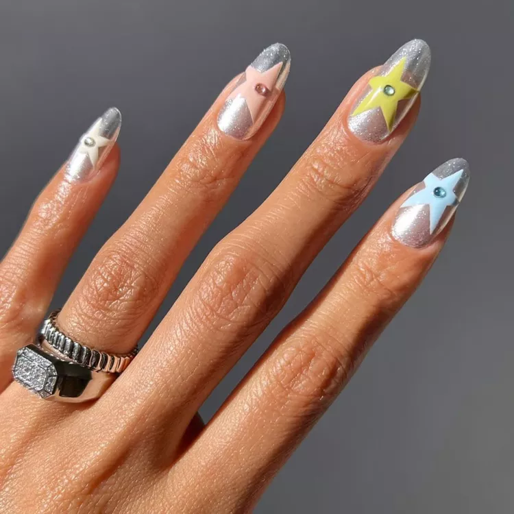 Western aesthetics receive a playful update in this whimsical design featuring silver base polish adorned with pastel stars and matching rhinestones. The unexpected color combination demonstrates how traditional Western motifs can be reimagined through contemporary color stories while maintaining their distinctive character. This approach particularly appeals to those who appreciate Western fashion elements but prefer to interpret them through a more colorful lens. The incorporation of both painted elements and three-dimensional accents creates visual interest that rewards close inspection.